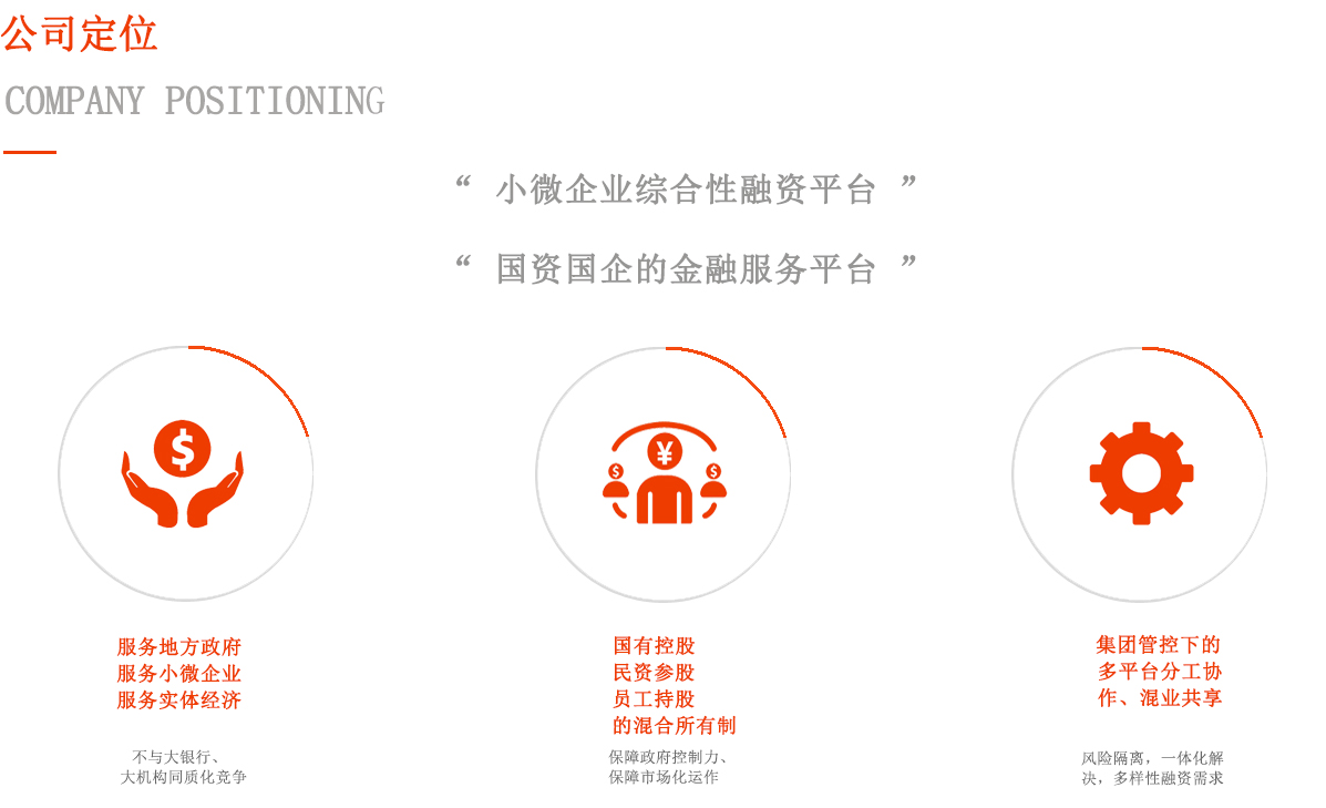 坚持“服务地方政府、服务小微企业、服务实体经济”的方向, 不与大银行、大机构同质化竞争;通过国有控股(相对)、民资 参股、员工持股的混合所有制,心怀小微,头戴红帽,走市场化 道路;通过集团管控下的多平台分工协作、混业共享,实现风险 隔离,一体化解决中小企业多样性融资需求。