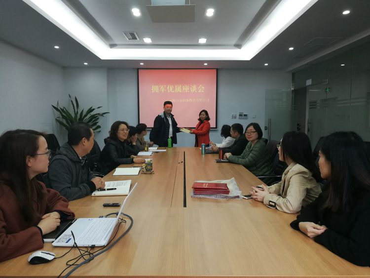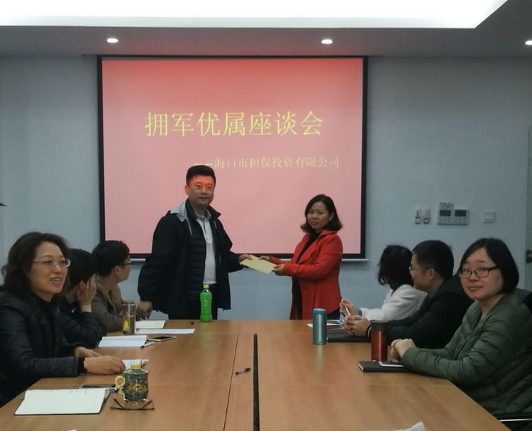 为贯彻落实《中共海口市委办公厅海口市人民政府办公厅关于做好2018年春节期间拥军优属工作的通知》文件精神,全面贯彻习近平新时代中国特色社会主义思想,进一步巩固军政军民团结,大力营造“军爱民、民拥军、军民团结一家亲”的浓厚社会氛围,落实拥军优属、拥政爱民各项工作,2月11日下午,担保公司召开春节期间拥军优属座谈会,会议由党支部书记李秀芬主持,公司许海果总经理、潘中连副总等领导班子及军人家属参加了座谈会。
