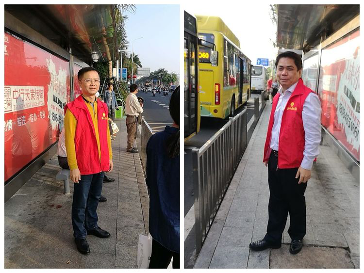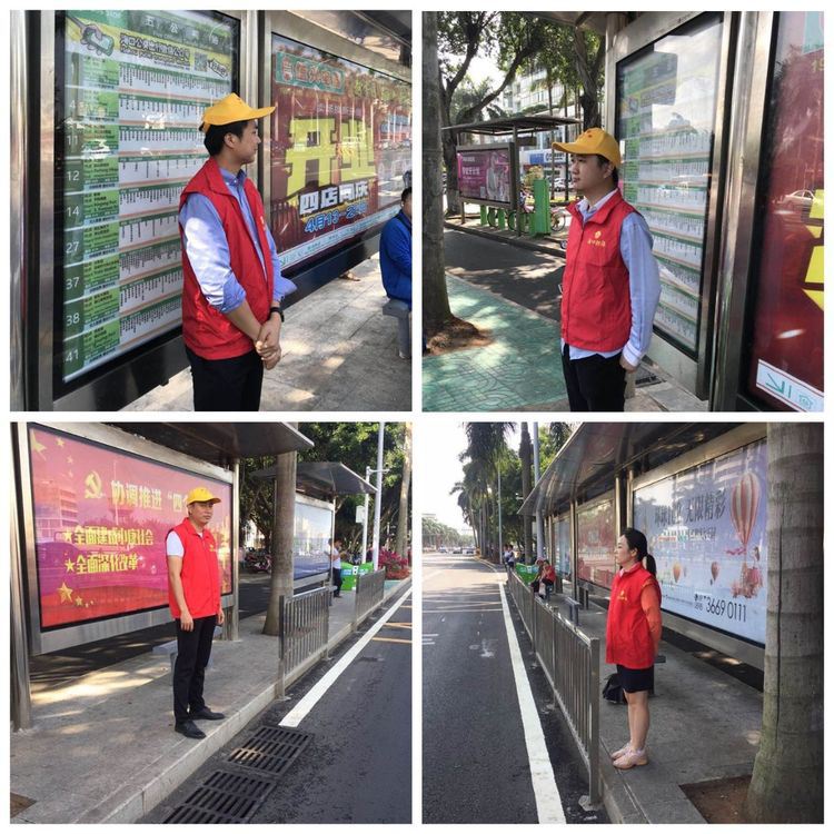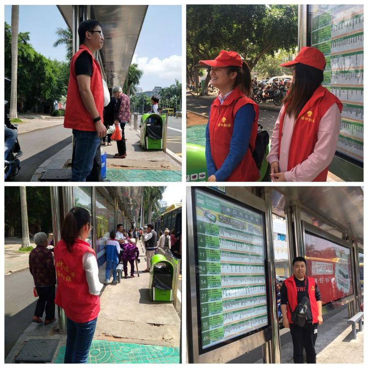本此次志愿服务活动时间是早上7点30分到晚上20点,我司志愿者统一穿着公司红马甲,分为早中晚三班,在秀英—府城方向4个公交站点(依次为:省彩票中心站、国兴大道路口站、东站、五公祠站),每班每个站点2名志愿者。