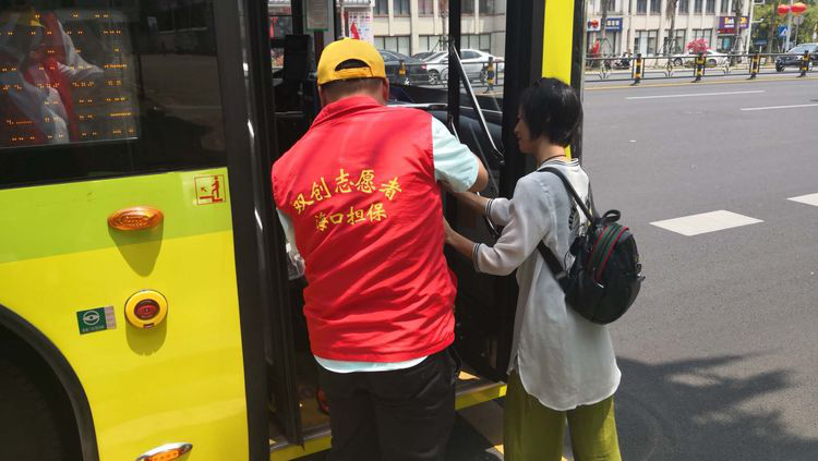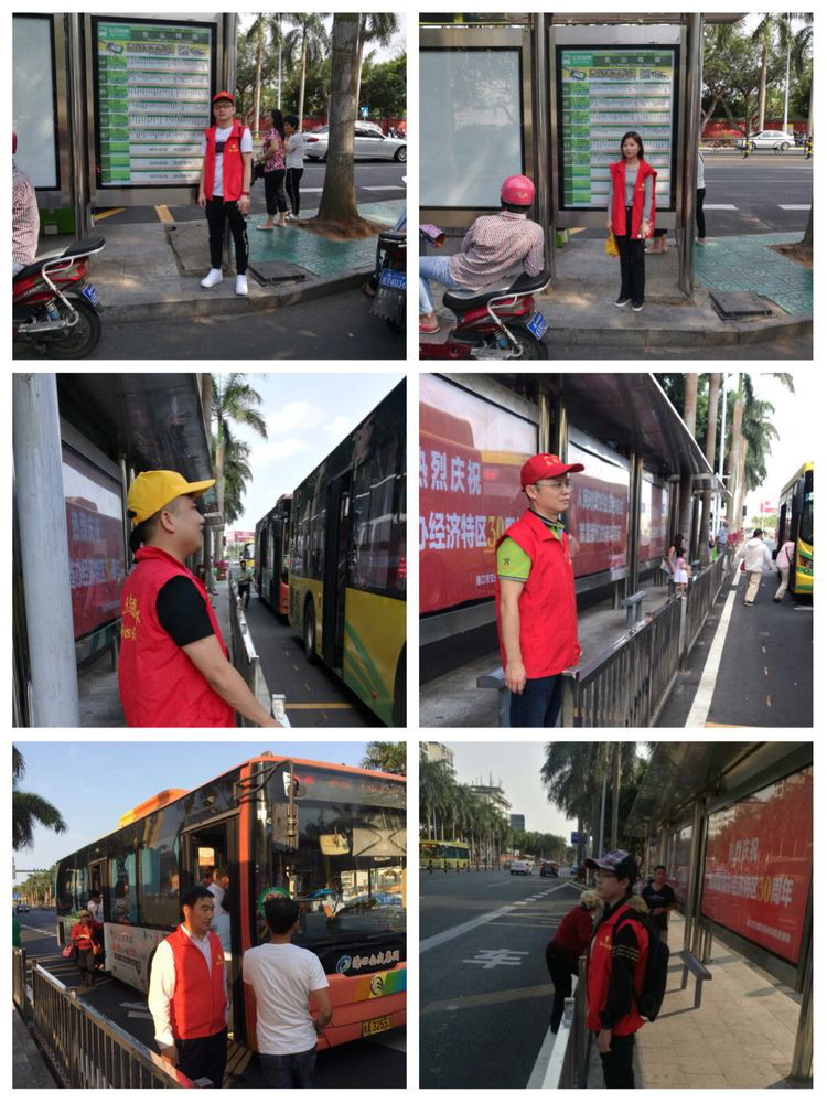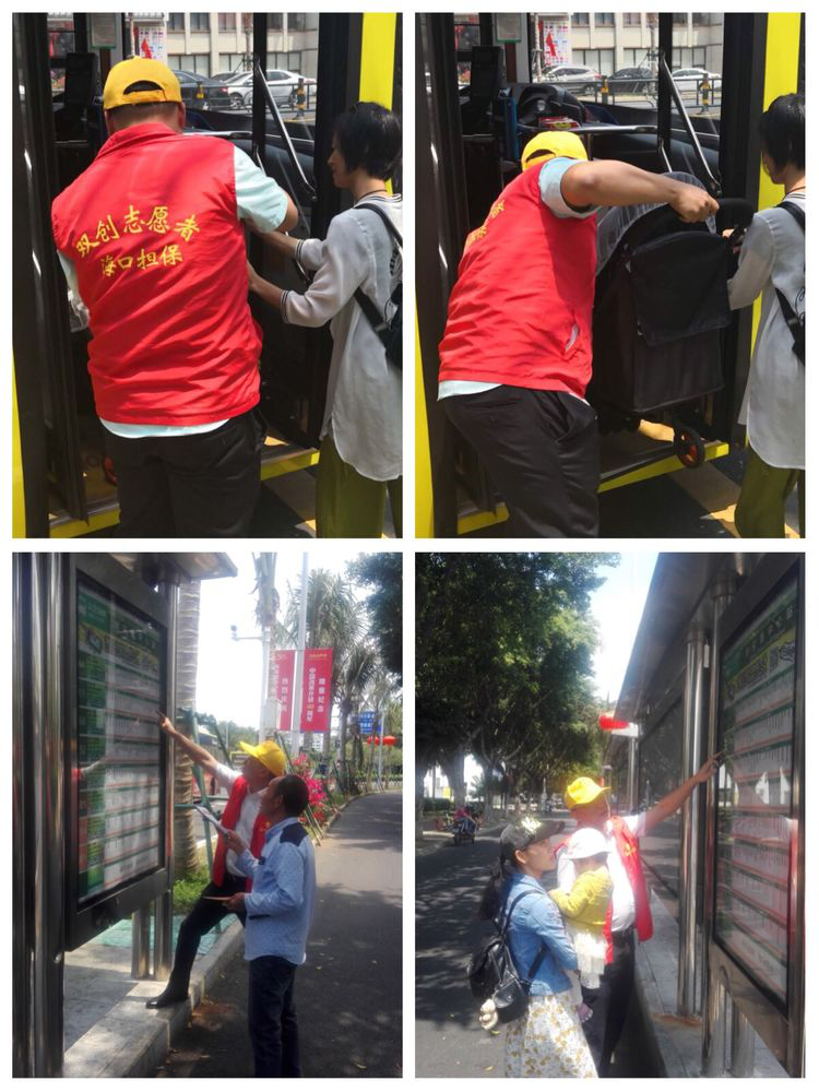 担保公司志愿者在公交站台帮助带小孩的乘客上车和为市民提供路线向导.